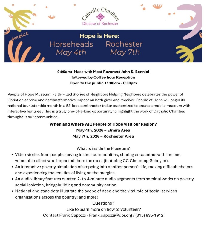 - People of Hope traveling museum by Catholic Charities. Coming to St. Marianne Cope May 7!